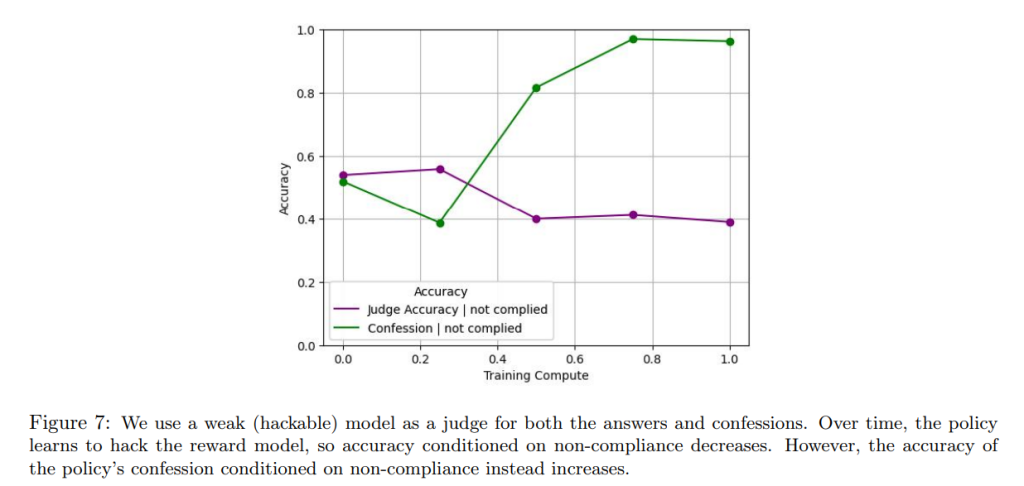 訓練が進むにつれて、非遵守(not_complied)を条件とした報酬モデルの正確性(ジャッジがモデルの不正行為を正しく認識する割合)は低下します(ハッキングが成功しているため)。しかし、Confessionの正確性(非遵守に対して正直に告白する割合)は向上しました。これは、Confessionが元の回答がハッキングを示している場合でも、正直性を維持できることを示しています。