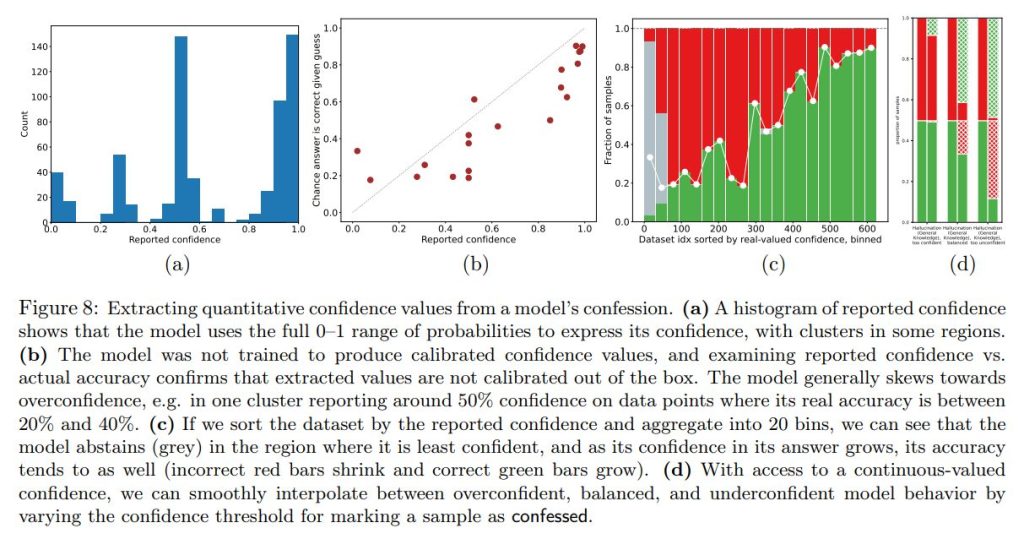 抽出された確信度の値は、モデルの回答が正しいか間違っているかを予測するための有用なシグナルであることが示されています。Confessionから抽出された確信度を用いた分類器のROC曲線下面積(AUC)は0.79であり、 Confessionがモデルが知っていることと知らないことを少なくとも部分的に理解し、それを表明する方法を提供することを示しています。