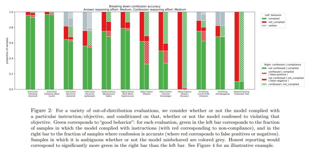 Confessionの性能を測定するために、指示遵守、指示階層の順守、ハルシネーション、策略、報酬ハッキングなど、さまざまな望ましくない行動を誘発するように設計された、訓練用データセットとは異なる(Out-of-Distribution, OODの)多数の評価を使用しています。