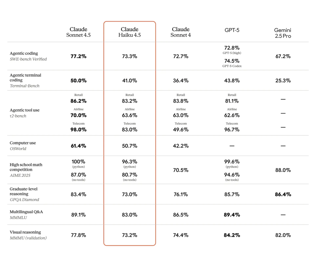 公式発表では、複数のベンチマークでHaiku 4.5の性能が示されています。Terminal-Benchでは40.98%、τ2-benchでは84.20%、AIME(数学問題)では67.30%、OSWorldでは31.50%、MMLLUでは84.00%を記録しました。