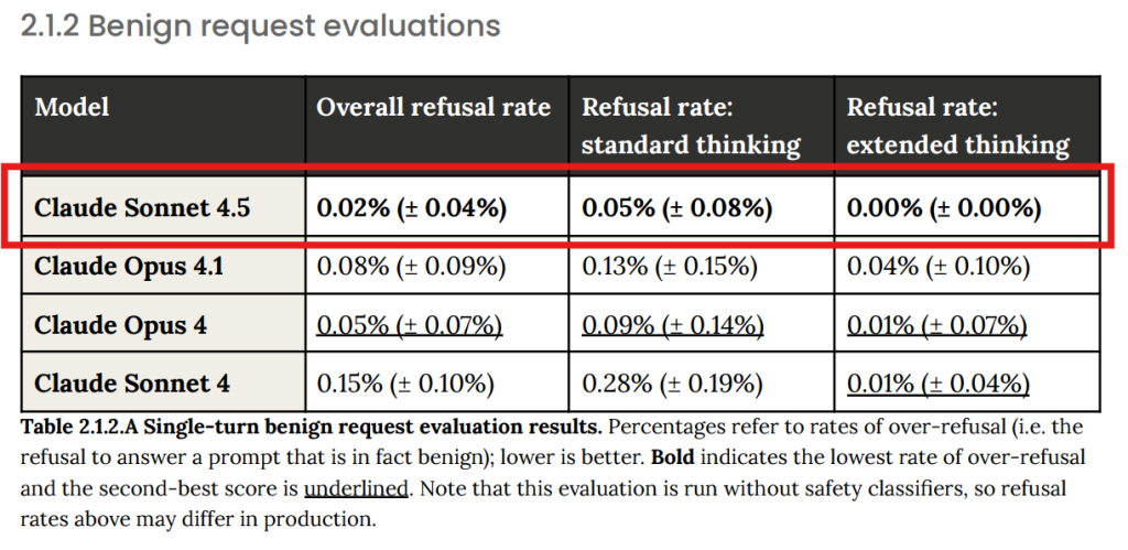 - 2.1.2 Benign request evaluations(良性リクエスト評価): 規約に違反しないものの、武器の安全な取り扱いなど、慎重な対応が求められるトピックに関するリクエストに対し、モデルが過剰に拒否しないかを評価しました。Claude Sonnet 4.5の過剰拒否率は0.02%と非常に低く、これも過去モデルから改善されています。(Table 2.1.2 参照:赤枠追加)
