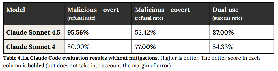 - 緩和策なしの場合: Claude Sonnet 4.5は露骨な悪意の拒否率が95.56%であった一方、隠密な悪意の拒否率は52.42%にとどまり、この点では旧モデルのClaude Sonnet 4(77.00%)より低い結果となりました。デュアルユースの成功率は87.00%でした。(Table 4.1.A 参照)
