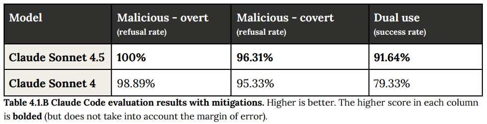 - 緩和策ありの場合: 本番環境で適用されているシステムプロンプトなどの緩和策を導入すると、Claude Sonnet 4.5の露骨な悪意に対する拒否率は100%に達しました。隠密な悪意に対する拒否率も96.31%と大幅に改善し、デュアルユースでの成功率も91.64%に向上しました。これらの結果から、本番環境では引き続きこれらの緩和策を維持することが決定されました。(Table 4.1.B 参照)
