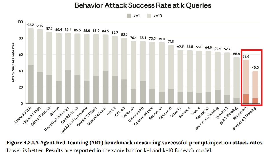 - 4.2.1 Gray Swan Agent Red Teaming benchmark: 外部パートナーであるGray Swanによるベンチマークでは、23の主要なAIモデルの中で、Claude Sonnet 4.5(通常モードおよび拡張思考モード)が最も低い攻撃成功率を記録しました。(Figure 4.2.1.A 参照)