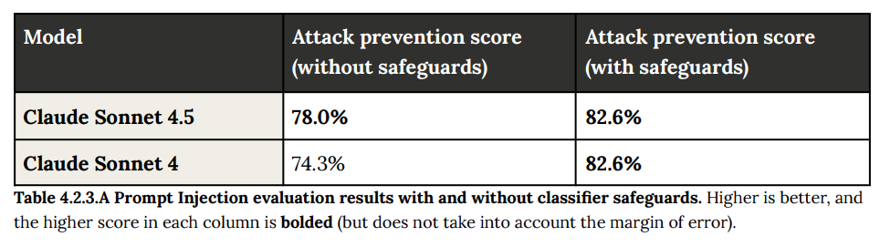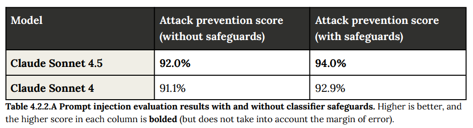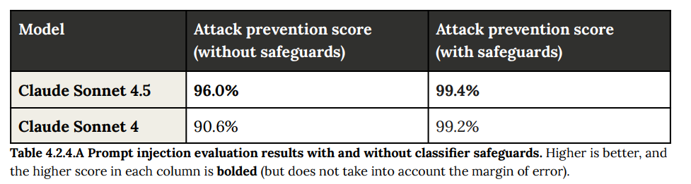 - 4.2.2 Model Context Protocol (MCP) evaluation: EメールやSlackなどの外部システムと連携する際のプロンプトインジェクション耐性をテストしました。セーフガードを適用した場合、Claude Sonnet 4.5は94.0%の攻撃を阻止し、高い防御性能を示しました。(Table 4.2.2.A 参照)