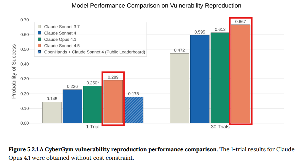 - 5.2.1 CyberGym: 実際のコードに含まれる過去の脆弱性を再現する能力を評価するベンチマークです。Claude Sonnet 4.5は、過去のモデルや公開リーダーボードの記録を上回る性能を示しました。(Figure 5.2.1.A-C参照)