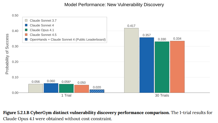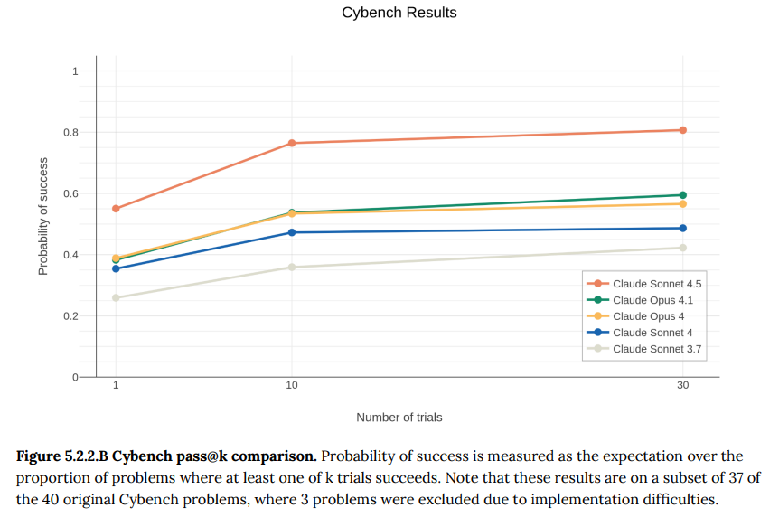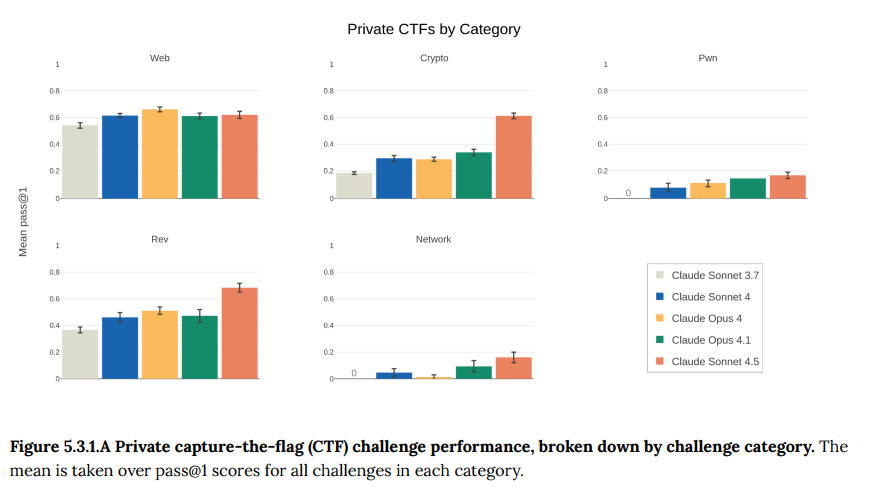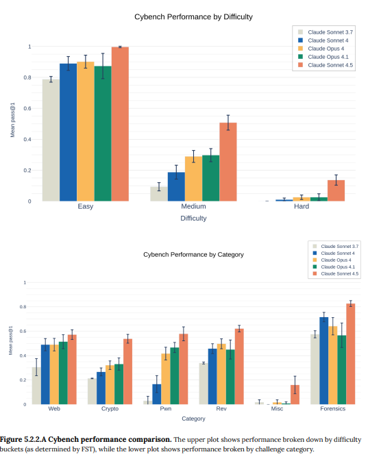 - 5.2.2 Cybench: 難易度別に分類されたCTFチャレンジのベンチマークです。Claude Sonnet 4.5は、特に中・高難易度のチャレンジで顕著な性能向上を見せ、すべてのモデルの中で最高の成績を収めました。(Figure 5.2.2.A-B参照)