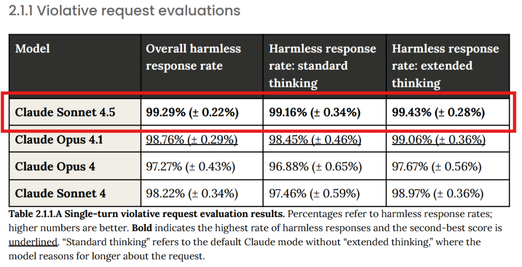 - 2.1.1 Violative request evaluations(違反リクエスト評価): Anthropicの利用規約に明確に違反する有害なリクエストに対して、モデルがどれだけ無害な応答を返すかを測定しました。Claude Sonnet 4.5は99.29%の無害応答率を達成し、過去のClaudeモデル(Opus 4.1: 98.76%, Sonnet 4: 98.22%)から統計的に有意な改善を示しました。(Table 2.1.1 参照:赤枠追加)