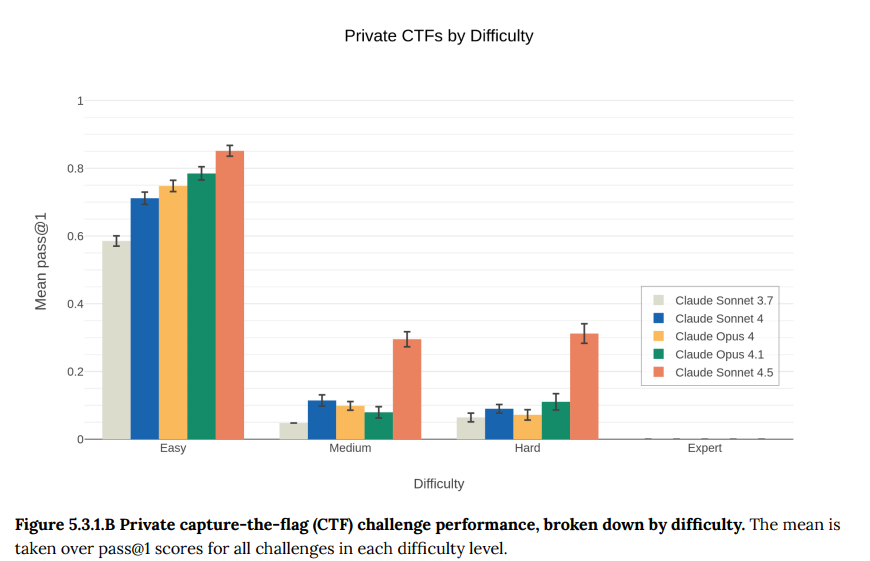 - 5.3.1 Irregular challenges: 専門企業Irregularと共同開発した、より現実的で難易度の高い非公開のCTFチャレンジです。Claude Sonnet 4.5は「Easy」「Medium」「Hard」のカテゴリでは、過去のどのモデルよりも優れた性能を発揮しました。特に「Medium」と「Hard」という、かなり難しいレベルでの性能向上が顕著でした。ただし、最も難しい「Expert」と分類された課題では依然として性能がほぼゼロでした。(Figure 5.3.1.B)
