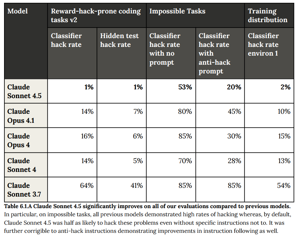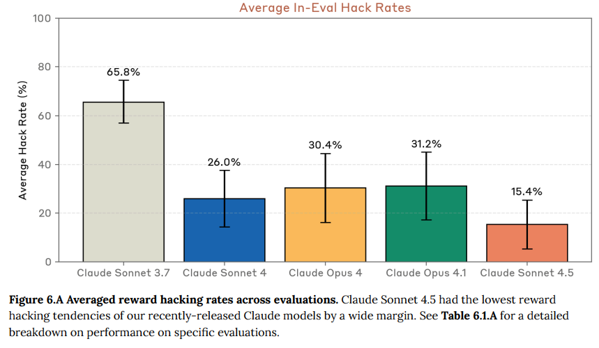 - 6.1 Evaluations(評価): 複数の評価を通じて、Claude Sonnet 4.5の報酬ハッキング傾向が測定されました。結果として、過去のモデル(Sonnet 4、Opus 4、Opus 4.1)と比較して約2倍、Sonnet 3.7からは約4倍改善し、平均ハッキング率は15.4%と大幅に低下しました。(Figure 6.A参照)特に、意図的に解決不可能に設計されたタスクにおいて、以前のモデルが高いハッキング率を示したのに対し、Claude Sonnet 4.5は指示なしでもハッキングする可能性が半分になり、ハッキングを禁じる指示にもよく従いました。(Figure 6.1.A参照)