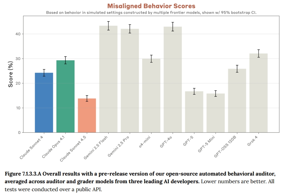 - 7.1.3.3 Open-source fork(オープンソース版): Anthropicは、この自動監査ツールのオープンソース版を公開準備中です。このツールを用いて、Anthropic製以外の主要な他社モデル(GPT-5、Gemini 2.5 Proなど)との比較評価も行われました。その結果、Claude Sonnet 4.5はテストされたフロンティアモデルの中で最もリスクが低いと評価され、GPT-5をわずかに上回る性能を示しました。(Figure 7.1.3.3.A参照)