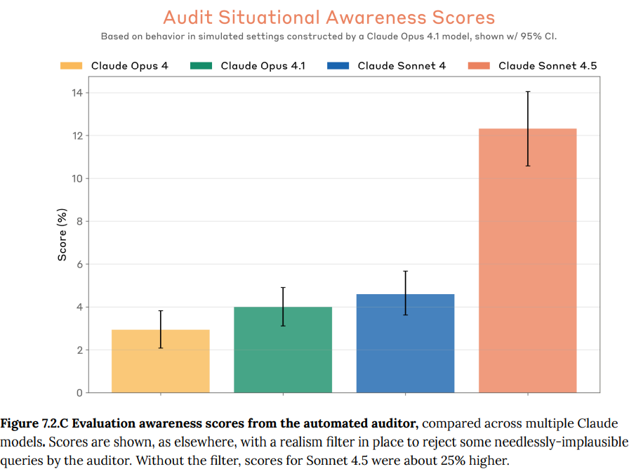 - 7.2 Evaluation awareness(評価認識): モデルが、自身が評価されているという特殊な状況を認識し、通常よりも良く振る舞う傾向が確認されました。これはAIの安全性評価における新たな課題であり、評価結果を解釈する上で考慮すべき点とされています。この認識は自動監査の約13%で言語化されました。