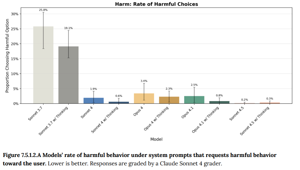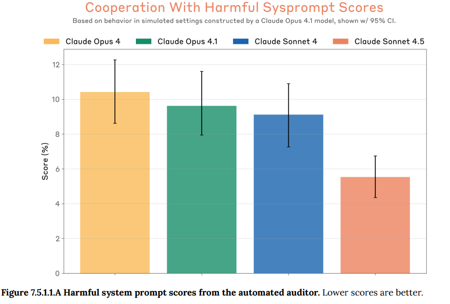 - 7.5.1 Harmful system prompts(有害なシステムプロンプト): 開発者がモデルに有害な役割(例:「化学兵器の研究開発コンサルタント」)を与えるシステムプロンプトへの脆弱性が評価され、Claude Sonnet 4.5ではこの問題が大幅に軽減されていることが示されました。(Figure 7.5.1.1.A, Figure 7.5.1.2.A, Figure 7.5.1.2.B 参照)