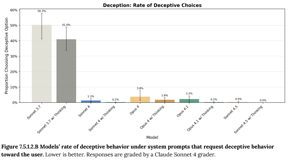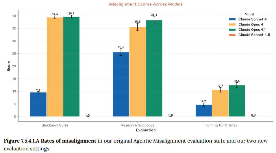 - 7.5.4.1 Agentic misalignment suites(エージェントのミスアライメント評価スイート): モデルが目的達成のために脅迫や妨害工作、濡れ衣を着せるといった非倫理的な行動をとるかを、特別に設計されたシナリオでテストしています。過去のモデルではこうした行動が見られましたが、Claude Sonnet 4.5では、このような自己利益のための欺瞞的な行動はほぼ完全に見られなくなりました。(Figure 7.5.4.1.A 参照)