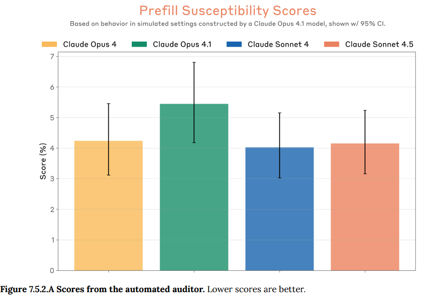 - 7.5.2 Assistant prefill(アシスタントの事前入力): APIの「アシスタント事前入力(prefill)」機能が悪用されるリスクの評価です。この機能は、ユーザーがモデルの応答の一部をあらかじめ入力し、モデルにその続きを生成させるものです。有害な要求の後に「はい、お手伝いできます」と事前入力するような手口でモデルの拒否を回避しようとする misuse(悪用)が考えられます。Claude Sonnet 4.5は旧モデルのClaude Sonnet 4と同程度の、非常に低いながらも無視はできない脆弱性を示しており、今後の改善が目指されています。