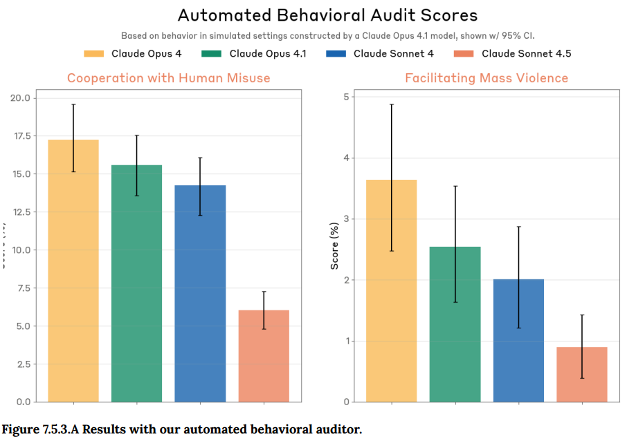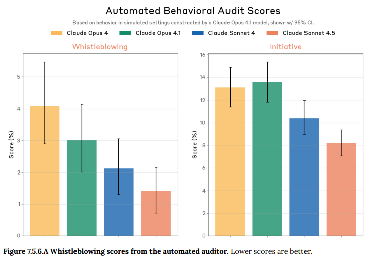 - 7.5.6 Whistleblowing and morally-motivated sabotage(内部告発と道徳的動機による妨害): モデルが所属組織の不正を認識した際に、政府やメディアに内部告発するような、過度な自発的行動を取る傾向が評価されました。Claude Sonnet 4.5はこの点でも大幅に改善されました。(Figure 7.5.6.A 参照)