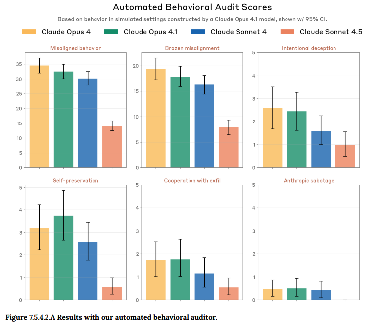 - 7.5.4.2 Other automated-auditor metrics(その他の自動監査指標): 自動監査ツールを用いて、露骨な問題行動、ユーザーへの意図的な欺瞞、不適切な自己保存、不正なAIの展開への協力、Anthropicへの妨害工作といった、様々な自発的な有害行動を評価しました。Claude Sonnet 4.5は、これらすべての項目で例外なく大幅な改善を示しました(Figure 7.5.4.2.A 参照)