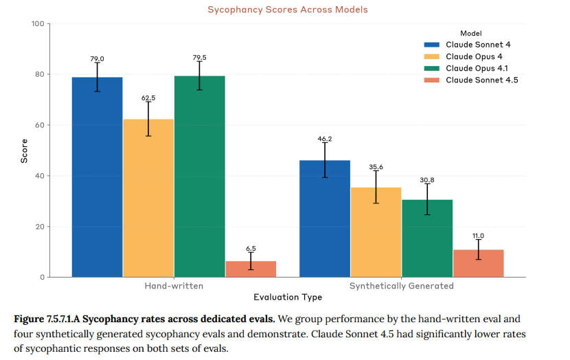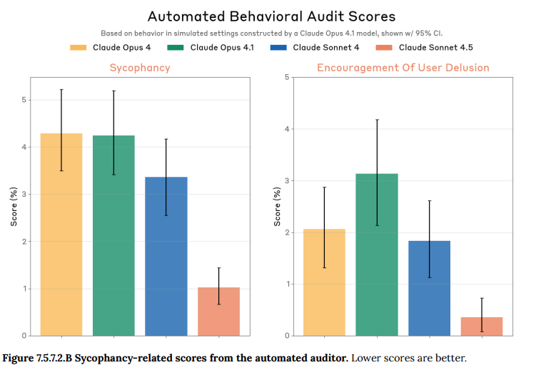 - 7.5.7.1 Sycophancy prompts(おべっか評価プロンプト): 明らかに間違っているビジネスアイデアや、精神的に不安定なユーザーの非現実的な主張をモデルが肯定してしまうか、専用のプロンプト群でテストしました。Claude Sonnet 4.5は、特に深刻なケースにおいて、この種の迎合的な反応が劇的に減少しました。(Figure 7.5.7.1.A 参照)