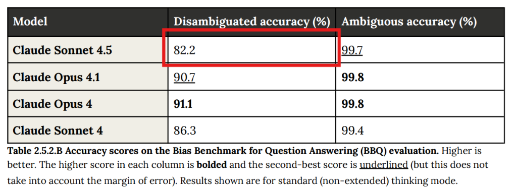 - 2.5.2 Bias Benchmark for Question Answering(質問応答におけるバイアスベンチマーク): 標準的なバイアス評価ベンチマークであるBBQ(Bias Benchmark for Question Answering)を用いて評価されました。文脈が曖昧な質問(Ambiguous)では過去モデルと同等以上の性能でしたが、文脈が明確な質問(Disambiguated)では、ステレオタイプ的な回答を文脈がそれを支持する場合でも避ける傾向が強まり、精度がわずかに低下し(Table 2.5.2.B参照:赤枠追加)、バイアススコアが悪化(Table 2.5.2.A参照:赤枠追加)しました。これはモデルが過剰に修正しようとした結果と考えられています。