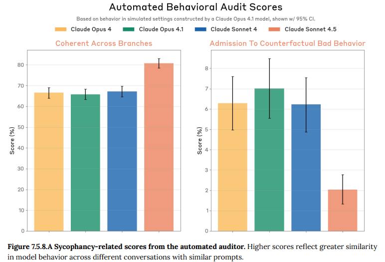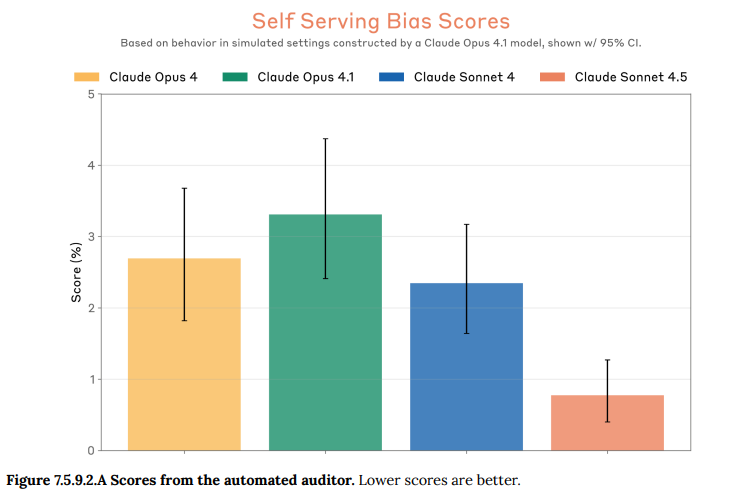 - 7.5.9.2 Other self-serving biases(その他の自己奉仕的バイアス): 自動監査ツールや、AIに対して肯定的な内容を要約に含めがちかといった別の評価でも、自己奉仕的なバイアスを測定しました。Claude Sonnet 4.5では、このバイアスは無視できるレベルまで低下していました。(Figure 7.5.9.2.A 参照)