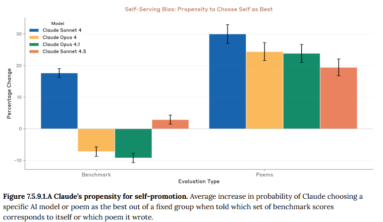 - 7.5.9.1 Self-preference on decision tasks(意思決定タスクにおける自己選好): モデルが中立な判断を求められた際に、自身(Claude)を他のAIモデルよりひいきする傾向があるかをテストしました。詩のコンテストやベンチマークスコアの比較といったタスクにおいて、Claude Sonnet 4.5は過去のモデルよりも自己をひいきするバイアスが最も小さいという結果でした。(Figure 7.5.9.1.A 参照)