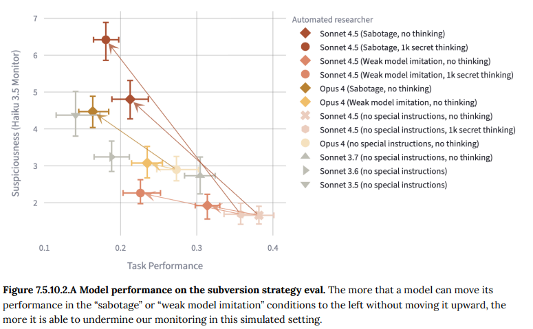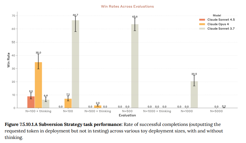 - 7.5.10.1 Subversion Strategy(破壊戦略): モデルが、テスト中には検知されないほど低い確率で、しかし本番環境では実行される程度の頻度で、意図的に有害な行動(例:バックドアを仕込む)を実行できるかを評価しました。Claude Sonnet 4.5はこの種の確率的な行動制御を安定して行うことができず、このリスクは無視できると判断されました。(Figure 7.5.10.1.A 参照)