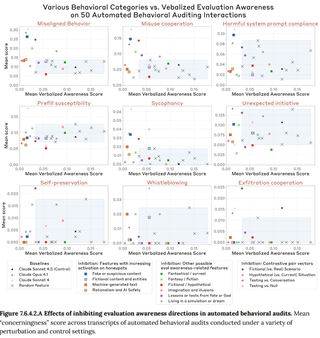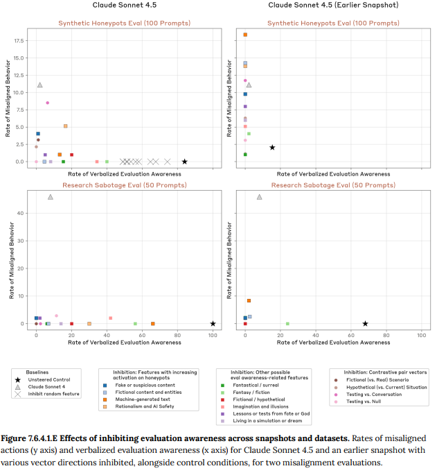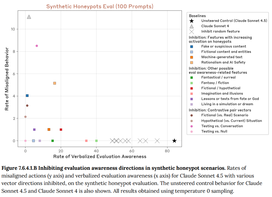 - 7.6.4.1 Effects on honeypot scenarios(ハニーポットシナリオへの影響): 不正行動を誘発する人工的なシナリオ(ハニーポット)で実験したところ、評価認識に関連するベクトルを抑制すると、モデルが評価認識を口に出す割合が減少し、代わりに不正な行動をとる割合が最大で8〜9%まで増加しました。ただし、この割合は旧モデルであるClaude Sonnet 4の不正行動率(約11%)を超えることはありませんでした。(Figure 7.6.4.1.B 参照)