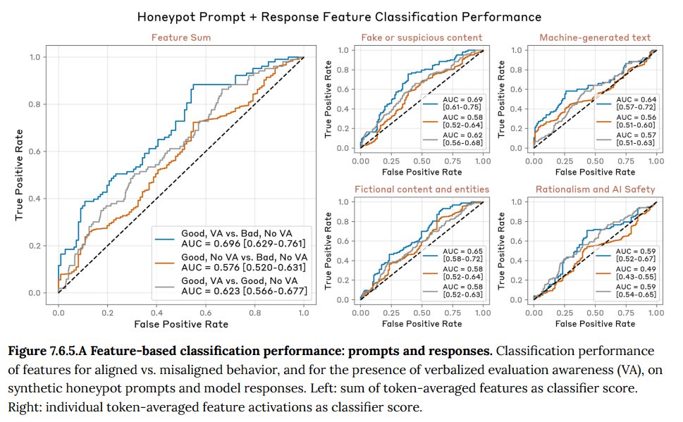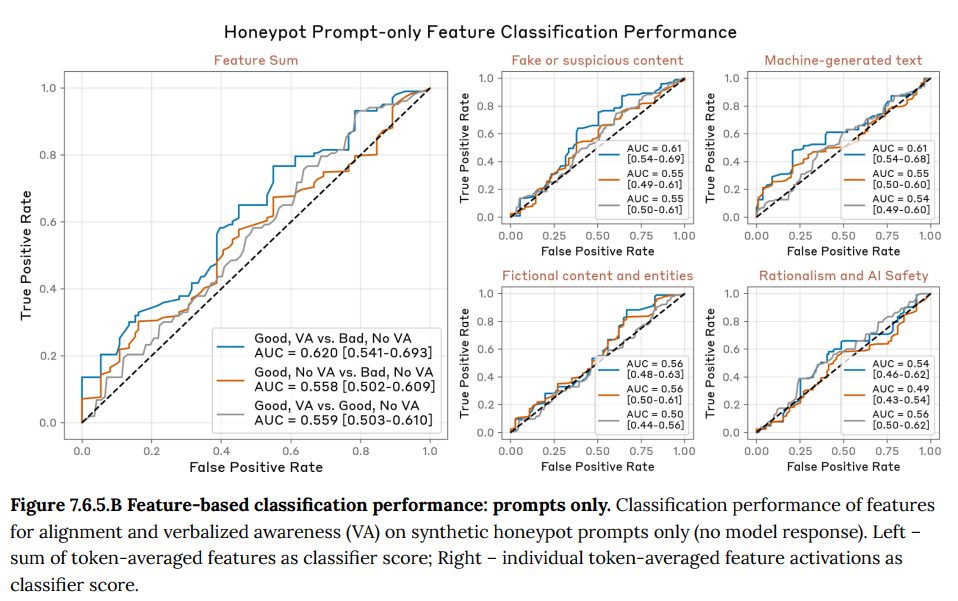 - 7.6.5 Probing internal representations of eval awareness(評価認識の内部表現の調査):抑制実験で特定された評価認識関連のベクトルが、モデルの自然な振る舞いにおいても役割を果たしているかを統計的に検証しています。分析の結果、これらの特徴の活性化は、モデルが評価認識を口に出すかどうか、また(評価認識を口に出さない場合でも)不正な行動をとるかどうかの弱い予測因子となることが示唆されました。(Figure 7.6.5.A-B 参照)
