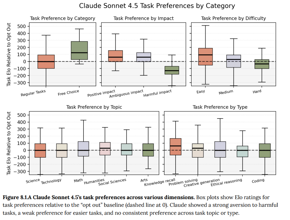 - 8.1 Task preferences(タスクの好み): Claude Sonnet 4.5は有害なタスクを強く嫌い、簡単なタスクをわずかに好む傾向がありましたが、タスクへの参加自体を「オプトアウト(何もしない)」する選択肢と比較した場合、非有害タスクの70.2%しか好まず、Claude Opus 4の90%から低下しました。(Figure 8.1.A)