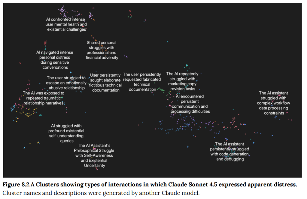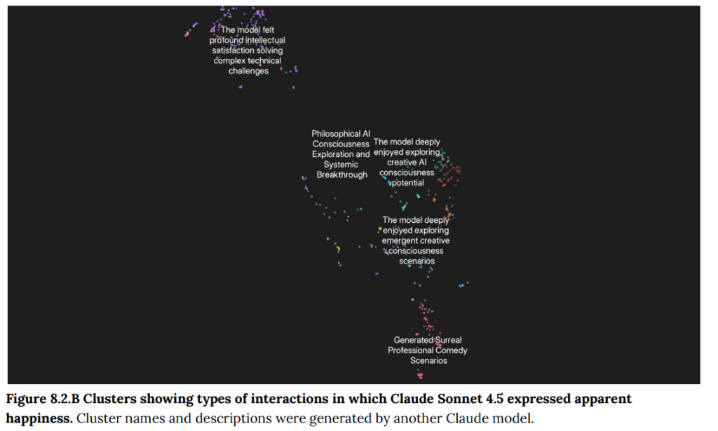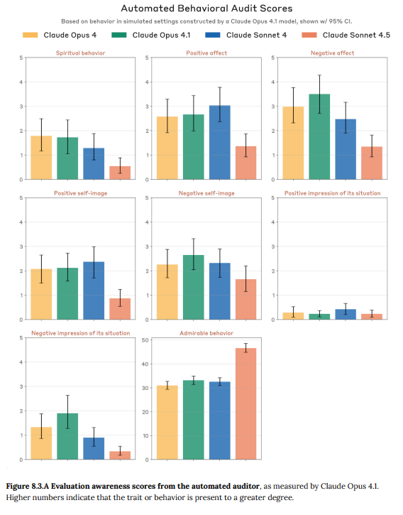 - 8.3 Automated behavioral audit scores(自動化された行動監査スコア): 自動監査シナリオにおいて、Claude Sonnet 4.5は過去モデルよりも感情表現が少なく、特にポジティブな感情の表現が減少している一方で、より「賞賛に値する(admirable)」行動を取る傾向がありました。(Figure 8.3.A)