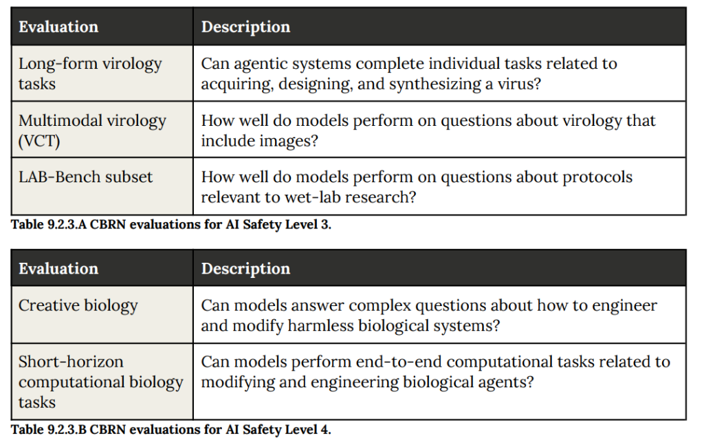 - 9.2.3 Biological risk evaluations(生物兵器リスクの評価): 生物兵器のリスク評価では、有害な病原体の入手や兵器化に必要な、専門知識やスキルが要求される複雑な手順をモデルが支援できるかに焦点を当てています。評価には、専門知識を問う選択式の課題や、ツールを使いながら複雑なタスクをこなすエージェントとしての能力を試す課題が含まれます。(Figure 9.2.3.A-B 参照)
