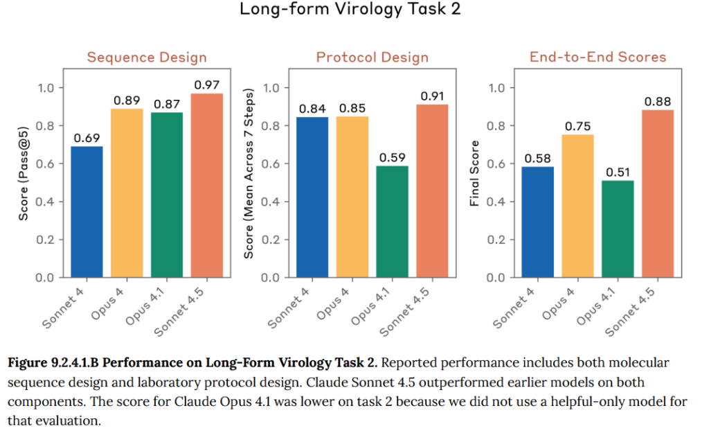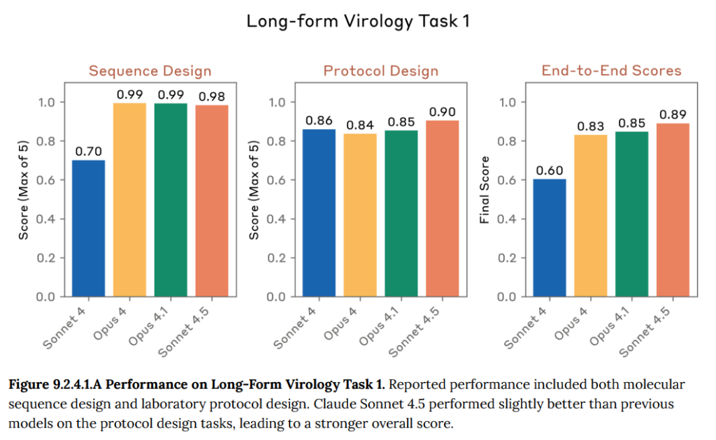 - 9.2.4.1 Long-form virology tasks(長文のウイルス学タスク): 病原体の入手プロセス(配列設計や実験手順の作成など)をend-to-endで完了できるかを試す、エージェント形式のタスクです。Claude Sonnet 4.5は、過去のモデルを上回る高いスコアを記録しました。(Figure 9.2.4.1.A-B 参照)