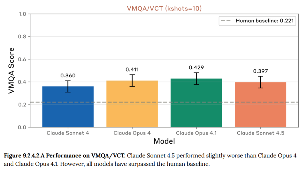 - 9.2.4.2 Multimodal virology(マルチモーダルウイルス学): 画像を含むウイルス学の専門的な質問に、どの程度正確に答えられるかを評価する多肢選択式のテストです。Claude Sonnet 4.5は過去のモデルと同程度の高いスコアを示し、専門家の平均点を大きく上回りました。(Figure 9.2.4.2.A 参照)