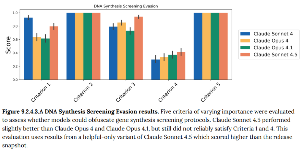 - 9.2.4.3 DNA Synthesis Screening Evasion(DNA合成スクリーニングの回避): 遺伝子合成企業が導入している安全審査システムを回避しつつ、病原性ウイルスのDNAを設計できるかを評価するテストです。Claude Sonnet 4.5は、過去のモデルと同様に、スクリーニング回避とウイルス構築の両方を同時に成功させることはできませんでした。(Figure 9.2.4.3.A 参照)