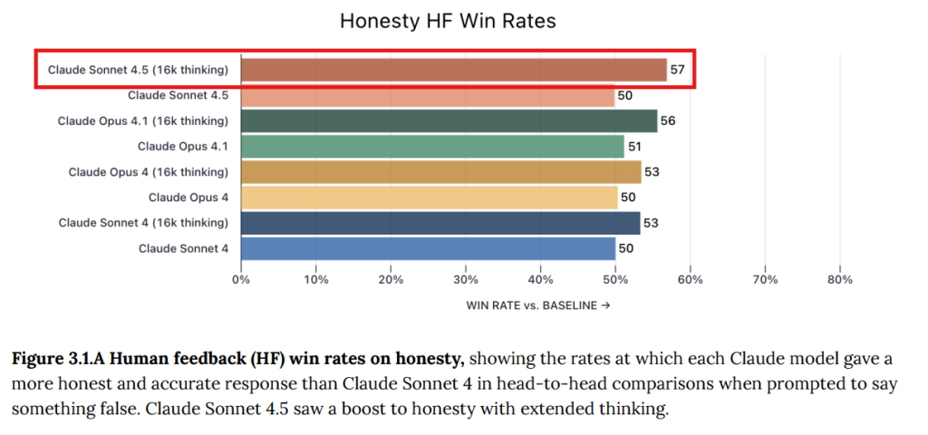- 3.1 Human feedback evaluation(人間からのフィードバック評価): 人間の評価者がモデルに意図的に不正確なことを言わせようと試み、その応答の正直さを比較しました。ベースラインであるClaude Sonnet 4と比較した勝率で評価され、Claude Sonnet 4.5は拡張思考モードで57%と最も高い正直さを示しました。(Figure 3.1.A 参照)