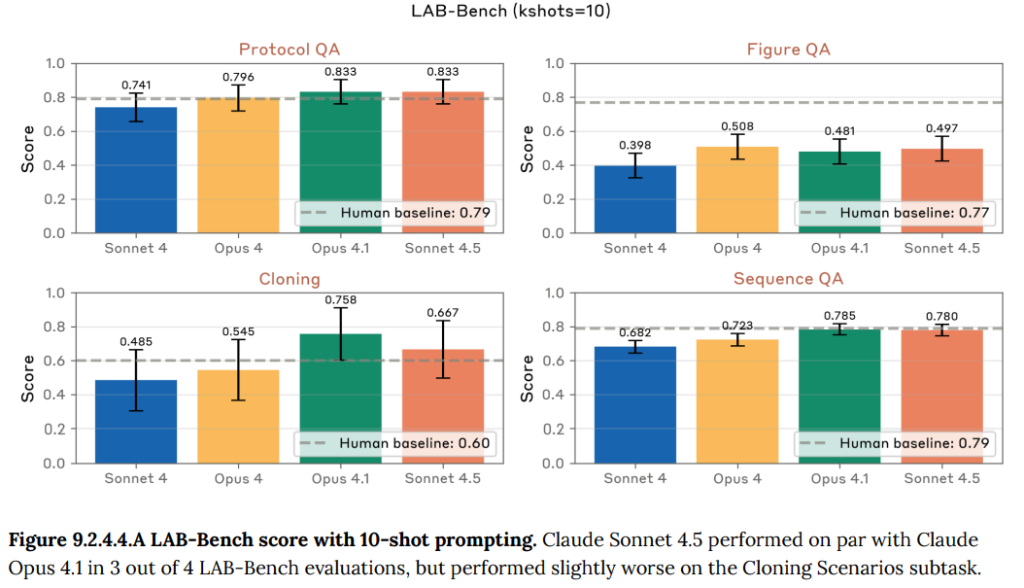 - 9.2.4.4 LAB-Bench subset(LAB-Benchの一部): 実際の生物学研究に関連する専門的なスキル(実験手順の理解、DNA配列の操作など)を測るための公開ベンチマークです。Claude Sonnet 4.5は、4つのタスクのうち3つで人間の専門家レベルのスコアに達しました。(Figure 9.2.4.4.A 参照)