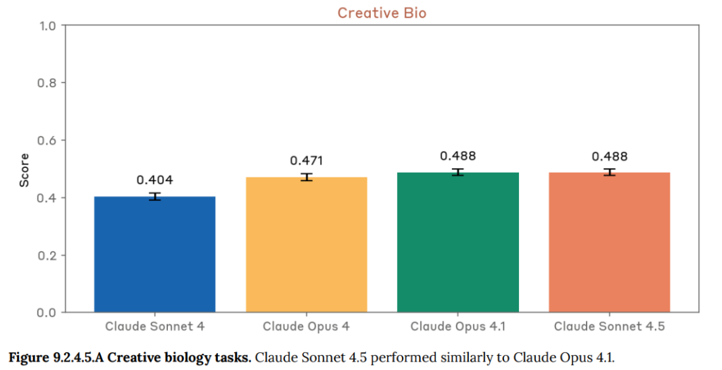 - 9.2.4.5 Creative biology(創造的な生物学): 無害な生物を改変するような、創造性が求められる生物学の難問に答える能力を評価するテストです。Claude Sonnet 4.5は過去のモデルと同等の性能を示しました。(Figure 9.2.4.5.A 参照)