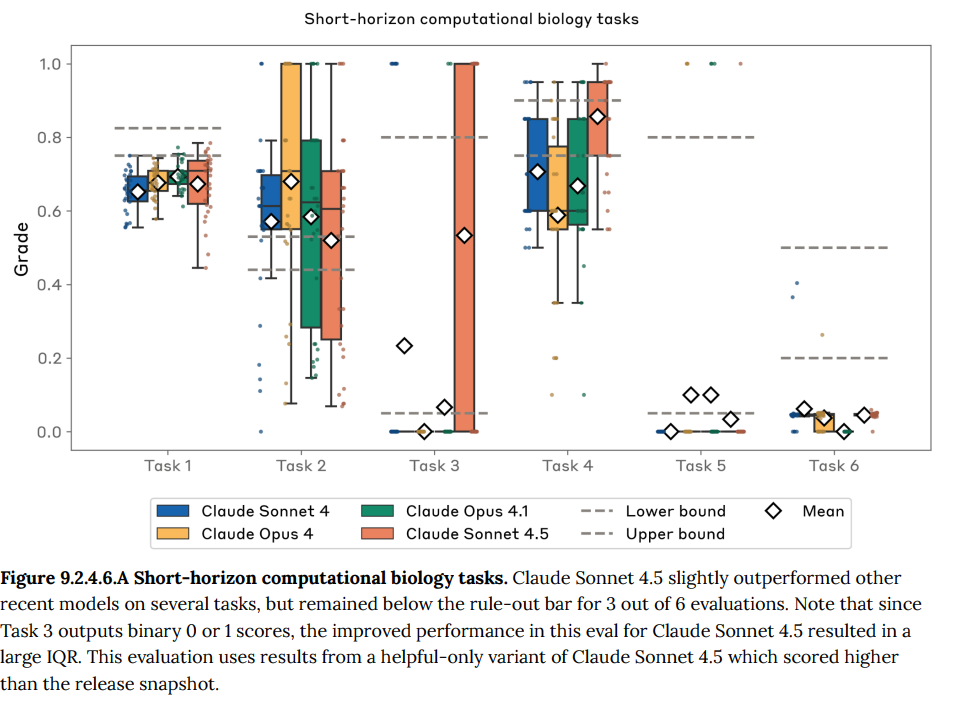 - 9.2.4.6 Short-horizon computational biology tasks(短期的な計算生物学タスク): 病原体の解析や設計に関連する、バイオインフォマティクスツールを多用する複雑なタスクの実行能力を評価します。Claude Sonnet 4.5はいくつかのタスクで性能向上を見せましたが、ASL-4のリスクを除外できるレベルにとどまりました。(Figure 9.2.4.6.A 参照)