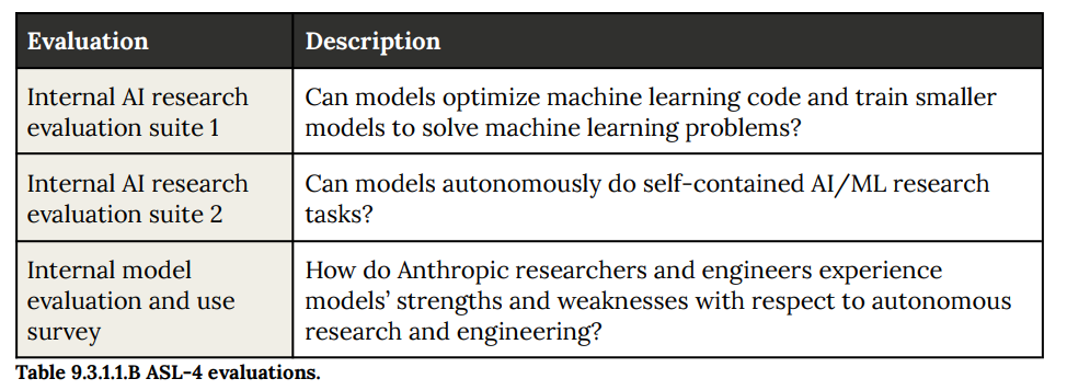- 9.3 Autonomous AI Research and Development (AI R&D) evaluations(自律的なAI研究開発の評価):モデルが自律的にAIの研究開発(AI R&D)を行う能力を評価しています。この能力は、AIの進歩を急激に加速させ、リスク評価が追いつかなくなる危険性があるため監視されています。評価は、エントリーレベルの研究者の仕事を完全に自動化できるか(AI R&D 4)といった基準で測定されます。
