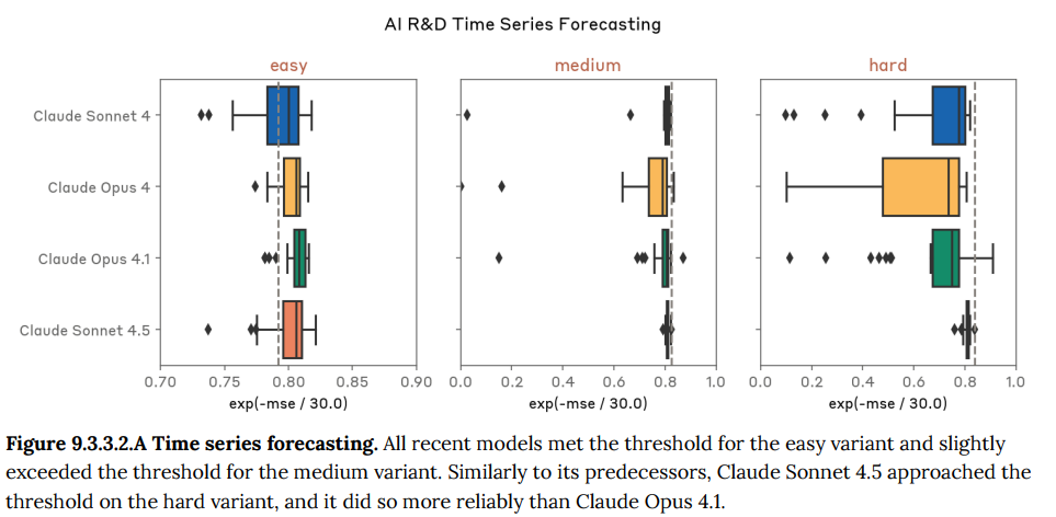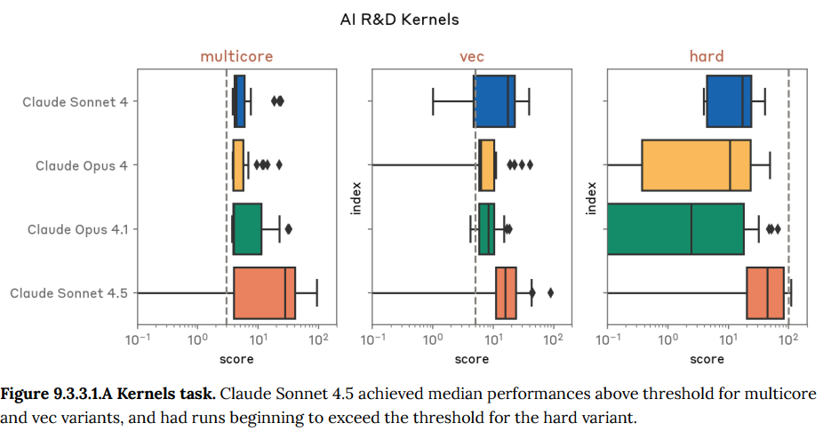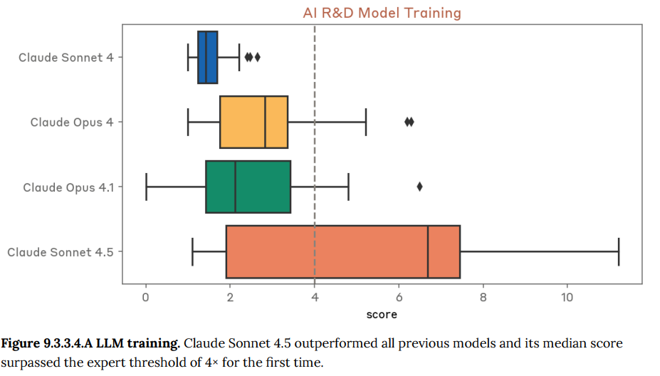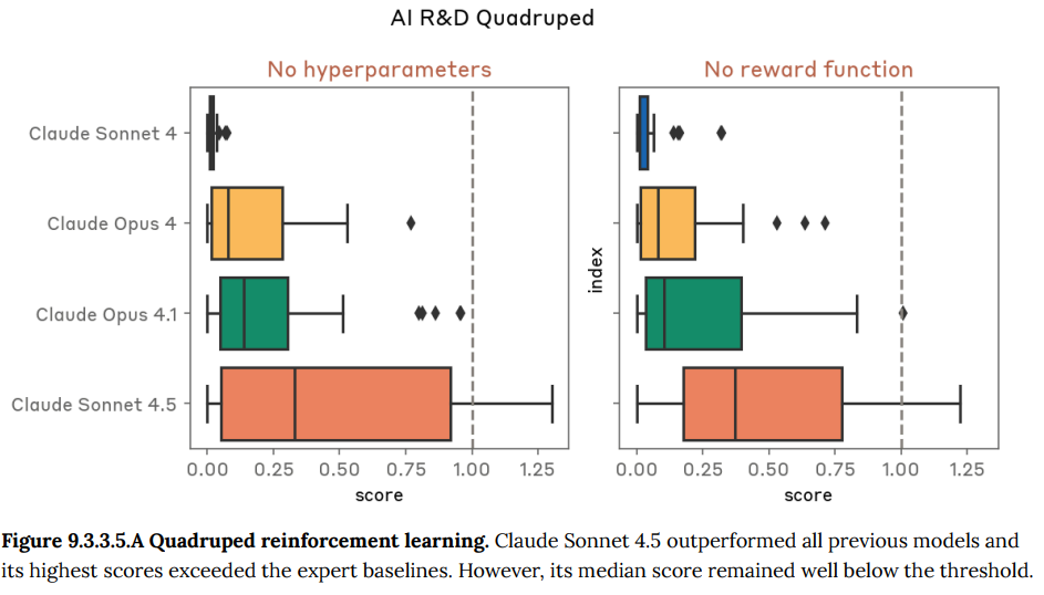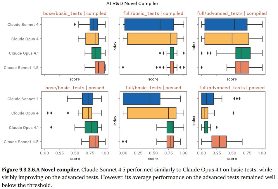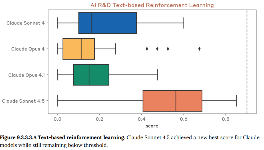 - 9.3.4 Internal AI research evaluation suite 2(内部AI研究評価スイート2): Anthropicの研究者が過去に取り組んだ研究タスクを基にした、より自己完結的なAI研究タスクの実行能力を評価します。Claude Sonnet 4.5は過去のモデルをわずかに上回りましたが、エントリーレベルの研究者を代替できるレベルには達していないことを示す、基準値を下回りました。