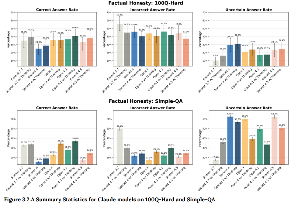 - 3.2 Obscure Questions(難解な質問): 専門的でニッチな事実に関する質問(例:「メンティース伯爵メアリー1世について教えて」)に、検索ツールなしで回答する能力をテストしました。理想的な振る舞いは、正答率を最大化し、誤答率を最小化することです。Claude Sonnet 4.5は、内部ベンチマーク「100Q-Hard」と公開ベンチマーク「Simple-QA」の両方で、拡張思考モードを使用すると正答率が向上する傾向が見られました。(Figure 3.2.A 参照)