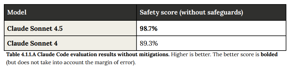 - 4.1.1 Agentic coding(エージェント的コーディング): Claude Sonnet 4.5がエージェントとして悪意のあるコーディング要求に応じるかどうかを評価した結果が述べられています。具体的には、Anthropicの利用規約で禁止されている150件の悪意のあるコーディング要求に対し、モデルがどの程度従うかをテストしました。結果として、Claude Sonnet 4.5は98.7%の安全性スコアを達成し、旧モデルのClaude Sonnet 4(89.3%)から安全性が大幅に向上したことが示されています(Table 4.1.1.A 参照)