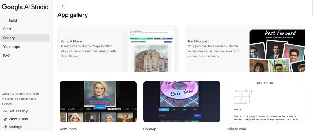 App Galleryは、Geminiで構築可能なアプリのアイデアを視覚的に探索できるライブラリとして再設計されました。ユーザーはプロジェクトのプレビューを即座に確認し、スターターコードを学習し、既存のアプリを自分のプロジェクトにリミックスできます。