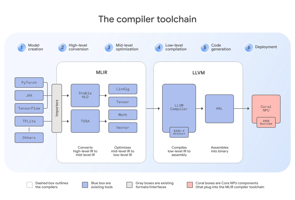 公式発表によれば、Coral NPUアーキテクチャはシンプルでC言語でプログラム可能なターゲットであり、IREEやTFLMなどの最新コンパイラとシームレスに統合できます。これにより、TensorFlow、JAX、PyTorchなどのMLフレームワークを容易にサポートできます。