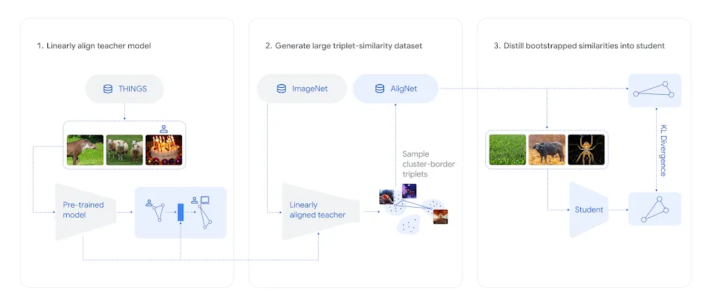 この問題に対処するため、研究チームは独自の3ステップ手法を開発しました。従来、認知科学者が収集したTHINGSデータセットには数百万の人間判断が含まれていますが、使用される画像は数千枚程度に限定されています。この規模では強力なビジョンモデルを直接ファインチューニングすると、すぐに過学習が発生し、事前学習で獲得したスキルを忘却してしまうという課題がありました。