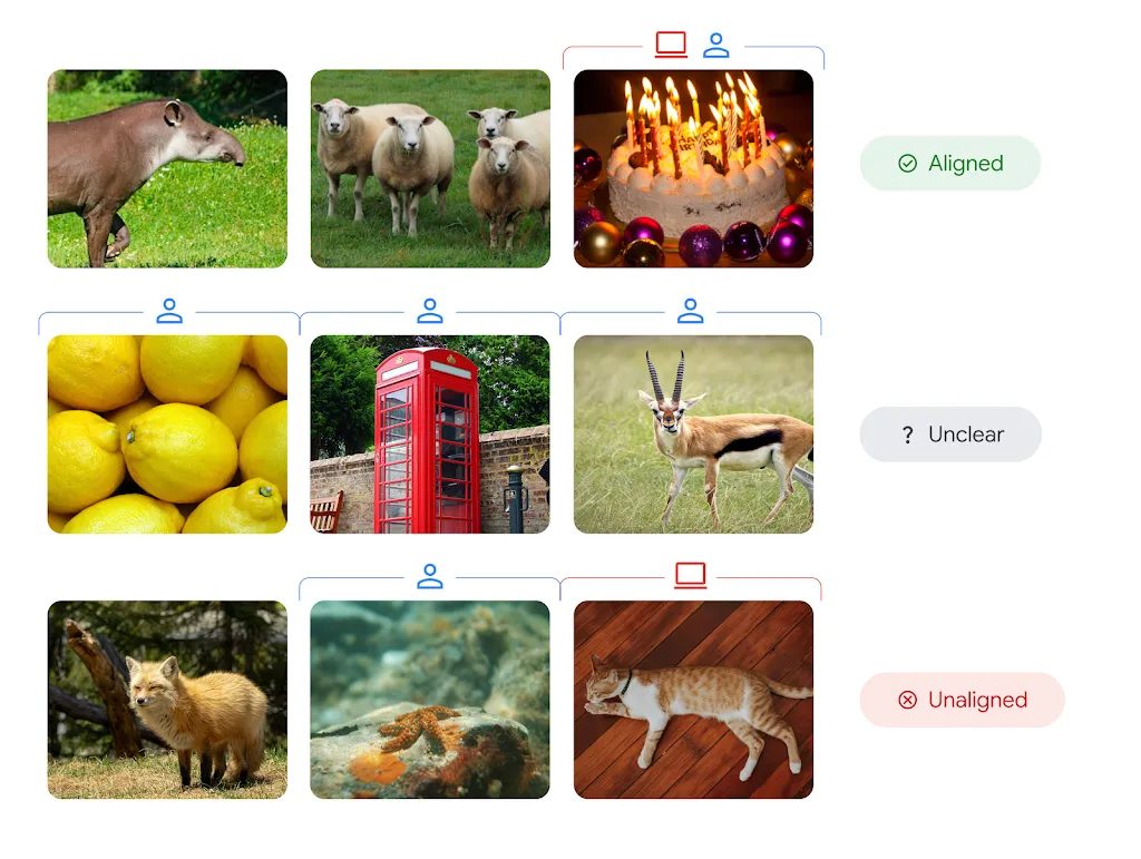 Google DeepMindの分析では、バク、羊、バースデーケーキのような明確なケースでは人間とAIの判断が一致します。しかし興味深いことに、人間の間で強い合意がある場合でも、AIは異なる判断をするケースが多数発見されました。具体例として、ヒトデ、猫、ラクダの3つが提示された場合、多くの人間はヒトデを仲間外れと判断しますが、ほとんどのビジョンモデルは背景色やテクスチャといった表面的特徴に着目し、猫を選択したと報告されています。