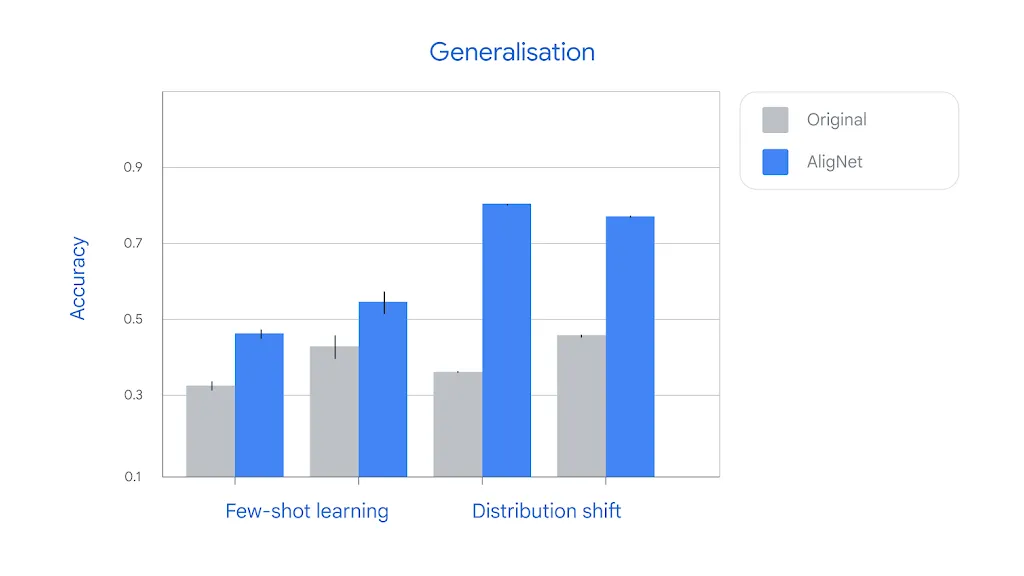 研究チームは、アライメント済みモデルを複数の認知科学タスクで評価しました。その1つが、多数の画像を類似度に基づいて配置するmulti-arrangementタスクです。さらに、研究チームが新たに収集した「Levels」という評価データセットも使用されました。Google DeepMindによれば、すべてのケースでアライメント済みモデルは人間との整合性が大幅に向上し、様々な視覚タスクで人間の判断とより高い頻度で一致したとされています。