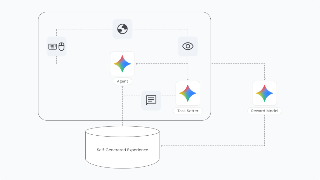 この自己改善サイクルは、Geminiが初期タスクとSIMA 2の行動に対する推定報酬を提供することから始まります。この情報は自己生成経験のバンクに追加され、エージェントは次世代の訓練に使用します。このプロセスにより、エージェントは人間のデモンストレーションや介入から完全に独立して、以前失敗したタスクを改善できます。