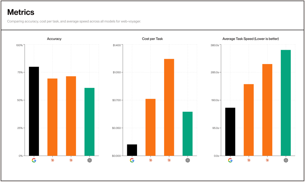 Browserbaseによる第三者評価では、Google、Anthropic、OpenAIの各Computer Use APIを同じ条件下で比較しました。同じプラットフォーム、プロンプトセット、アクセス日を使用することで、潜在的な変動要因を正規化しています。結果として、Gemini 2.5 Computer Useは精度、速度、コストのすべての面で他の主要プロバイダーを上回る性能を示しました。特筆すべきは、約18時間分のブラウザ実行を20分の実行時間に圧縮できたという点です。並列ブラウザインフラストラクチャにより、複数のタスクを同時に評価することが可能になり、トレーニングと評価の時間が大幅に短縮されました。