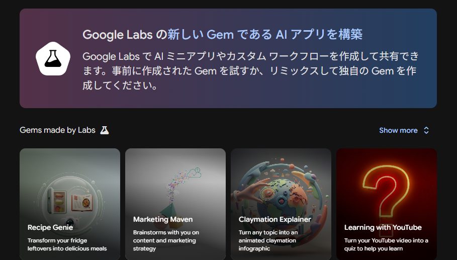 - Gems managerから利用でき、再利用可能なミニアプリを作成してGeminiをカスタマイズできる